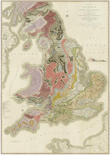 This famous map is considered to be the first geological map of a complete country ever made and was the culmination of over fifteen years’ work by its author, the English mineral and canal surveyor William Smith (1769-1839). The mapping is based around Smith’s discoveries that fossils could be used as indicators to identify specific rock strata, and that these strata appeared in a regular and predictable sequence across the country.