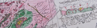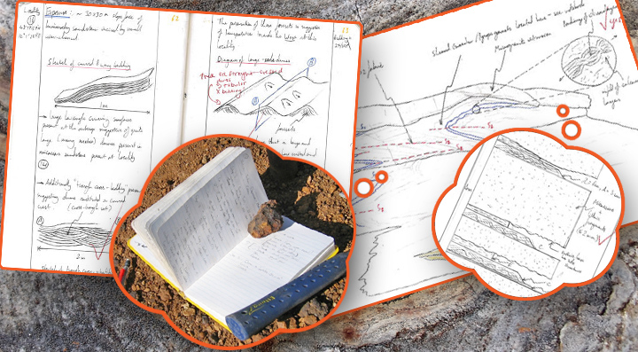 - The production of a field notebook with notes (such as strikes and dips) observations, interpretations, field sketches and interpretative diagrams.