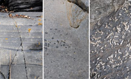 Above are pictures of the low grade turbidites at the eye of the needle in Macduff (biotite-zone), cordierite-porphyroblasts at Banff (cordierite-zone), and andalusite & staurolite porphyroblasts at Whitehills (Boyndie Bay beach).