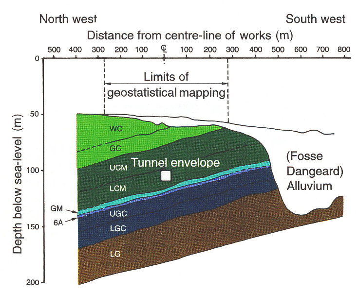 | Figure 2. Cross section showing Fosse Dangeard geology and tunnels (Download larger version) |
