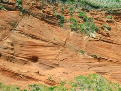 The cliffs began as windblown, oxidized red desert sands laid down as dunes: many of the exposures show beautiful dune cross bedding. Interbedded with the dune sandstones are beds of angular pebbles laid down by repeated flash floods during wetter periods.