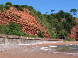 Walking south to north, starting at Coryton’s cove at the southern end of Dawlish's coast, Coryton Breccia (of many clast types including quartzite and pink feldspars) and Teignmouth Breccia (including Devonian and Carboniferous slates, cherts, and igneous rocks) can be seen there. These were laid down in an alluvial fan. A major fault at Coryton’s Cove brings these and the overlying Dawlish Sandstone together.