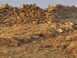 The quarry at the bottom of the slope, now almost completely filled in, was once nearly 40m deep and was the largest chromite working in Britain. A highly mechanised crushing and sorting plant was in operation at the quarry and a railway carried the chromite to Baltasound for shipping. Nearby is the earlier and now restored Hagdale crushing circle.
