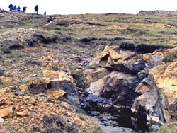 As you head up to the road you will be walking on harzburgite. Orthopyroxene crystals give it a knobbly texture in contrast to the smoother dunite. Heading west along the boundary you can see where the two rock types mix. Moving out of the harzburgite, to the quarries and spoil heaps of Nikkavord look out for bands of hard, black chromite minerals within the orange-brown dunite.