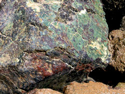 Kynance Cove is famous for its excellent exposures of striking serpentinite, and particularly good examples of both red and green serpentinite are seen within a natural tunnel on the beach, just past the café.