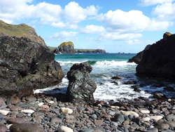 Cornish geology typically consists of black, folded slates and pale grey, blocky granites. At Kynance Cove however, the cliffs are made up of dark green and red rocks, polished by thousands of years of crashing waves to look like shiny snakeskin.