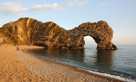 The natural sea arch at Durdle Door (top photo) is cut through steeply dipping Portland limestones, and erosion on the landward side of the arch has scoured out the softer Purbeck limestones and Wealden sandstones and siltstones.