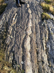 They have been strongly deformed and some superb folding and pull-apart structures are clearly visible.The rocks are also cut by wide veins of pegmatite with obvious large crystals of mica.