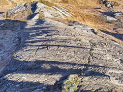 These glaciated slabs are found 4km west of Glenfinnan in the Scottish Highlands. The site lies only a short distance above the road (NM 858 814), but is not visible to motorists travelling west on the Road to the Isles.