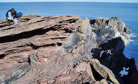 “On landing at this point, we found that we actually trode on the primeval rock, which forms alternately the base and the summit of the present land. It is here a micaceous schistus, in beds nearly vertical, highly indurated, and stretching from south-east to north-west. The surface of this rock runs with a moderate ascent from the level of low-water, at which we landed, nearly to that of high-water, where the schistus has a thin covering of red horizontal sandstone laid over it; and this sandstone, at the distance of a few yards farther back, rises into a very high perpendicular cliff. Here, therefore, the immediate contact of the two rocks is not only visible, but is curiously dissected and laid open by the action of waves.”