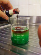Mix together roughly equal amounts of vinegar and washing up liquid, and add red food dye to give the experiment that molton lava look. |