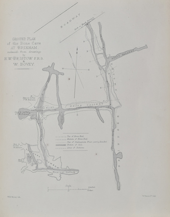 Left: 'Ground plan of the Bone Cave at Brixham...' from Joseph Prestwich, “Report on the exploration of Brixham Cave... 'Philosophical Transactions of the Royal Society', vol 163 (1873).