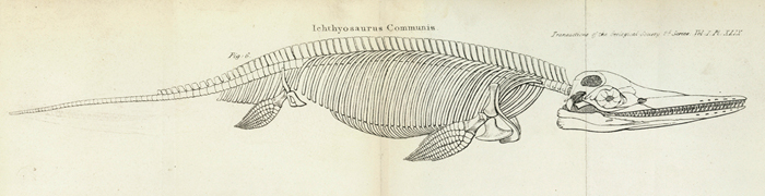 Reconstruction of the skeleton of an ichthyosaur, by W D Conybeare, 1824. From W D Conybeare, "On the Discovery of an almost perfect Skeleton of the Plesiosaurus. Transactions of the Geological Society of London, S2-1 (1824). GSL Library collections.