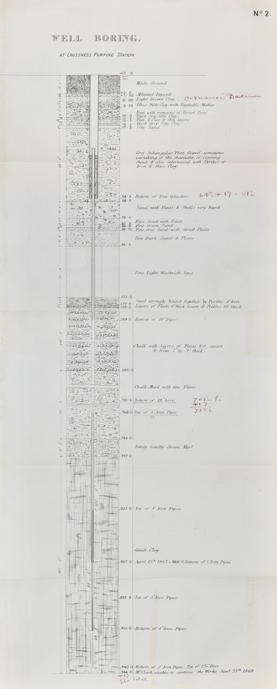 Section of the well sunk at Crossness showing the lack of the Lower Greensand stratum, from Joseph Bazalgette, ‘Reports by the Engineer on the boring operations at the Crossness Pumping Station’ (1869). Tracts: Prestwich P/3. Click here to enlarge