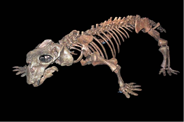 Cynognathus is an extinct mammal-like reptile. The name literally means ‘dog jaw’. Cynognathus was as large as a modern wolf and lived during the early to mid Triassic period (250 to 240 million years ago). It is found as fossils only in South Africa and South America.