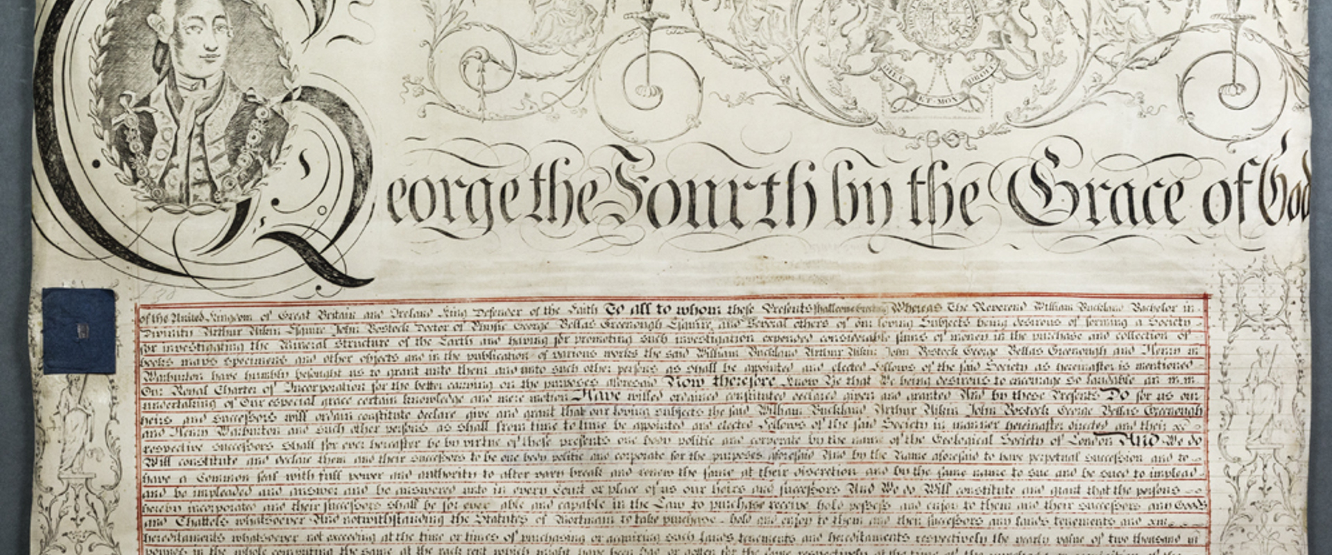 Now therefore know Ye that We being desirous to encourage so laudable an undertaking of Our especial grace certain knowledge and mere motion Have willed ordained constituted declared given and granted And by these Presents Do for us our heirs and successors will ordain constitute give and grant that our loving subjects the said William Buckland Arthur Alkin John Bostock George Bellas Greenough and Henry Warburton and such other persons as shall from time to time be appointed and elected Fellows of the said Society in manner hereinafter directed and their respective successors shall for ever hereafter be by virtue of these presents one body politic and corporate by the name of THE GEOLOGICAL SOCIETY OF LONDON And We do Will constitute and declare them and their successors to be one body politic and corporate for the purposes aforesaid And by the Name aforesaid to have perpetual succession and to have a Common seal with full power and authority to alter vary break and renew the same at their discretion and by the same name to sue and be sued to implead and be impleaded and answer and be answered unto in every Court or place of us our heirs and successors