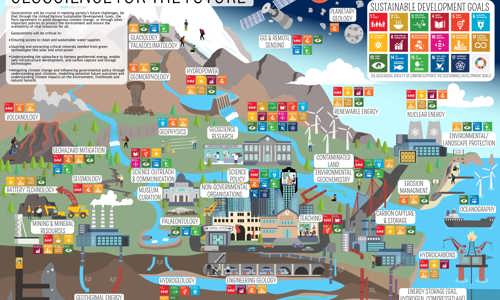Our Geoscience for the Future poster is a visual demonstration of how specific areas of geoscience contribute to this. As well as an English version, you can download the poster in a variety of world languages.