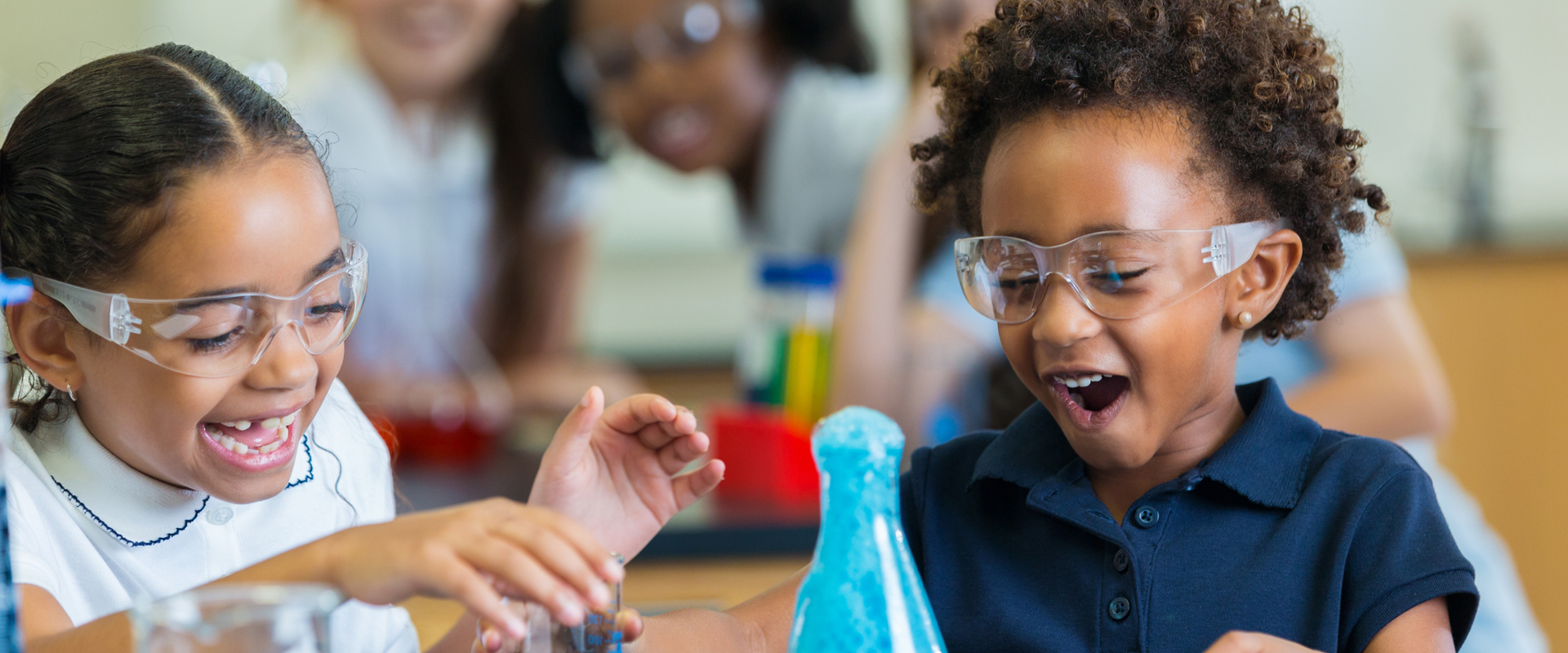 two small black girls smiling excitedly at their bubbling vial science experiment