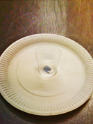 Attach the plastic cup to the plate using blue tack - you can use scissors to adjust the height of the cup, depending on how big you want your volcano to be! |