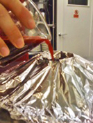 Mix together roughly equal amounts of vinegar and washing up liquid, and add red food dye to give the experiment that molton lava look. |