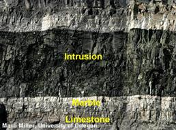 Contact Metamorphism (often called thermal metamorphism) happens when rock is heated up by an intrusion of hot magma.In this photo, the dark grey rock is an intrusion (a sill) between layers of a paler grey limestone. Just above and below the intrusion, the limestone has been altered to form white marble.