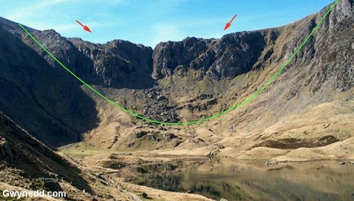 The rocks of Snowdon were erupted as volcanic lavas and ash flows around 450 million years ago. They were later folded in the Caledonian mountain-building, as northern and southern Britain were joined in an enormous plate collision about 50 million years later. Evidence of this downfolding (syncline) is clearly seen in the back-wall of Cwm Idwall.