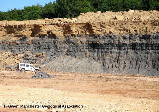 The clay layers shown in the photograph below were laid down as muds during the Jurassic Period about 150 million years ago. They contain fossils such as ammonites (ancient relatives of squid and cuttlefish) which tell us the age of the rocks and show they were laid down in the sea. These particular clays (known as the Oxford Clay) are quarried extensively in Bedfordshire and Cambridgeshire for making bricks.They contain some quartz and calcite as well as clay, that make the bricks particularly strong; they also contain organic remains which burn as the bricks are heated in the brick kiln. This helps to reduce energy costs in brick manufacture.