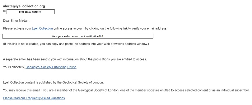 When you are given access to a new publication, the system sends an email to your registered email address to confirm this entitlement and also a reminder to activate your account if not already done so. This email is sent from lyellcollection[at]geolsoc.org.uk