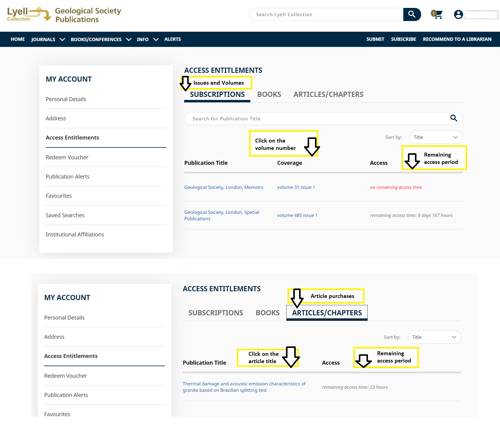 To access purchased content during your access period: login to the site, click on your name (top, right), then My Account. The purchased article / issues / volume / eBook will be listed in Access Entitlements with the time remaining for access (screenshots below).