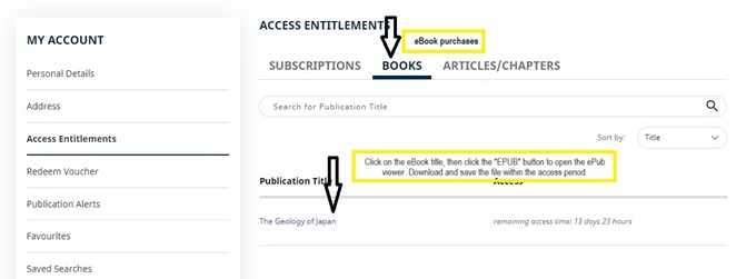 To access purchased content during your access period: login to the site, click on your name (top, right), then My Account. The purchased article / issues / volume / eBook will be listed in Access Entitlements with the time remaining for access (screenshots below).