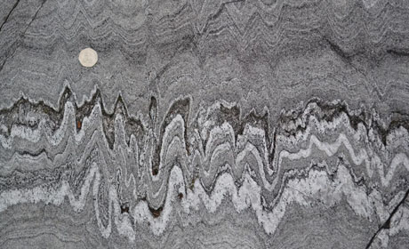 Structures in the exposed roots of ancient mountain belts can display bewildering complexity. The smooth glaciated pavements around the shore of Loch Monar reservoir are excellent examples, developed in metamorphosed sandstones of the Moine rocks.