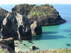Cornish geology typically consists of black, folded slates and pale grey, blocky granites. At Kynance Cove however, the cliffs are made up of dark green and red rocks, polished by thousands of years of crashing waves to look like shiny snakeskin.