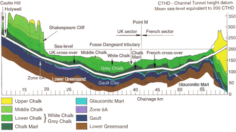 From this low point in the UK section the tunnels continue in the Marly Chalk and gently rise towards the mid-Channel position. Over this central section, the tunnels run relatively close to a major geological feature, the Fosse Dangeard, a massive buried valley formed by scouring of the sea bed to a depth of 85m during the Late Devensian.