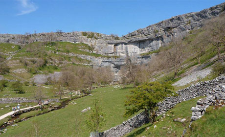 Malham Cove is a spectacular natural limestone formation which comprises a curved limestone cliff at the head of a valley. The limestone pavement at the top is a superb example of later karst weathering.