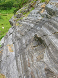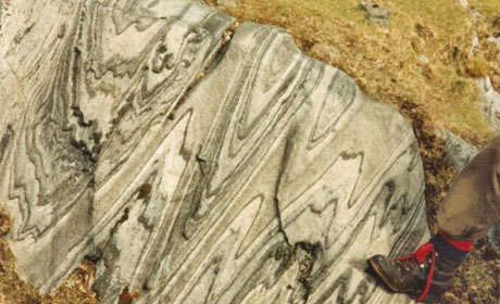 This area of folded rocks in western Ireland has been described as a structural and metamorphic paradise! Amphibolite facies schists, marbles and amphibolites have been folded together during metamorphism to produce a remarkable array of folds on all scales during the Grampian orogeny.