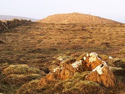The quarry at the bottom of the slope, now almost completely filled in, was once nearly 40m deep and was the largest chromite working in Britain. A highly mechanised crushing and sorting plant was in operation at the quarry and a railway carried the chromite to Baltasound for shipping. Nearby is the earlier and now restored Hagdale crushing circle.