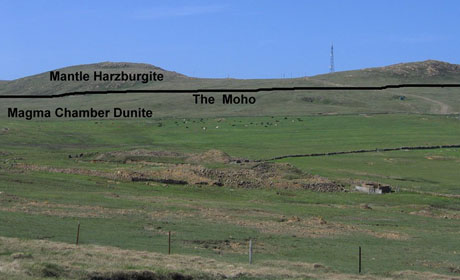 Along most of the trail that leads up to the site of the Moho you will be walking on dunite, formed in the lowest layer within the magma chamber.
