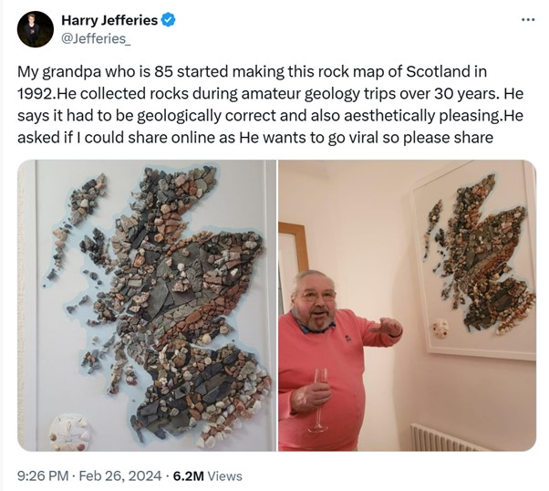 Harry created this map of Scotland by travelling around the country collecting rocks. He shot to fame on social media earlier this year when his grandson posted about the map on X (Twitter). Since February, the post has been viewed more than 6.2 million times.