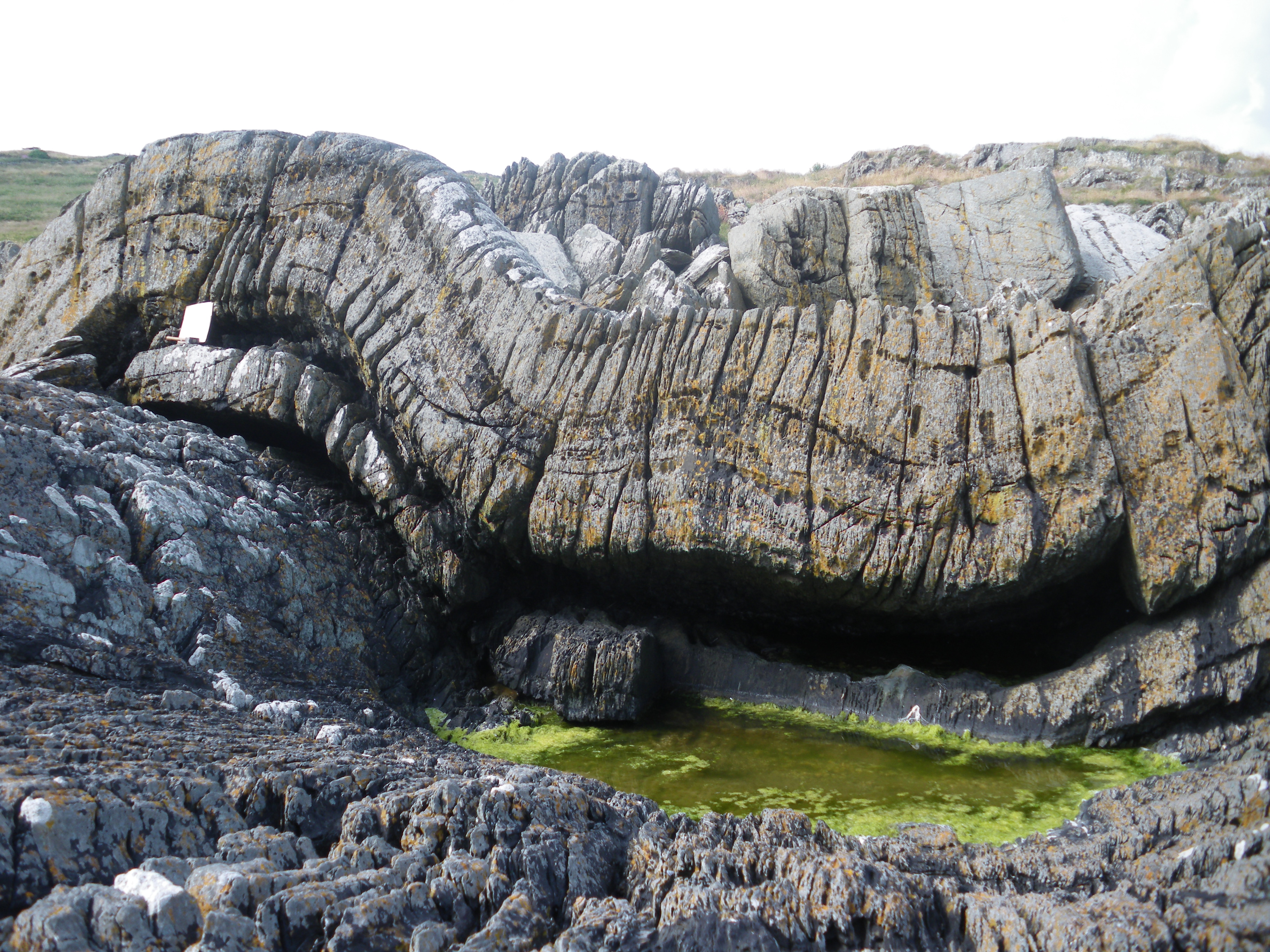 activity. The structural evolution of the area was complex following and during closure of the Iapetus Ocean but evidence for this is easily seen in the spectacular folding in the cliff exposures and the associated cleavage. The rocks are predominantly Silurian age greywackes and mudstones that formed on the bottom of the Iapetus Ocean. These are intruded by Caledonian lamprophyre dykes which are a relatively uncommon type of intrusion, and have been linked with deep melting in subduction zones such as that associated with the closure of the Iapetus Ocean.