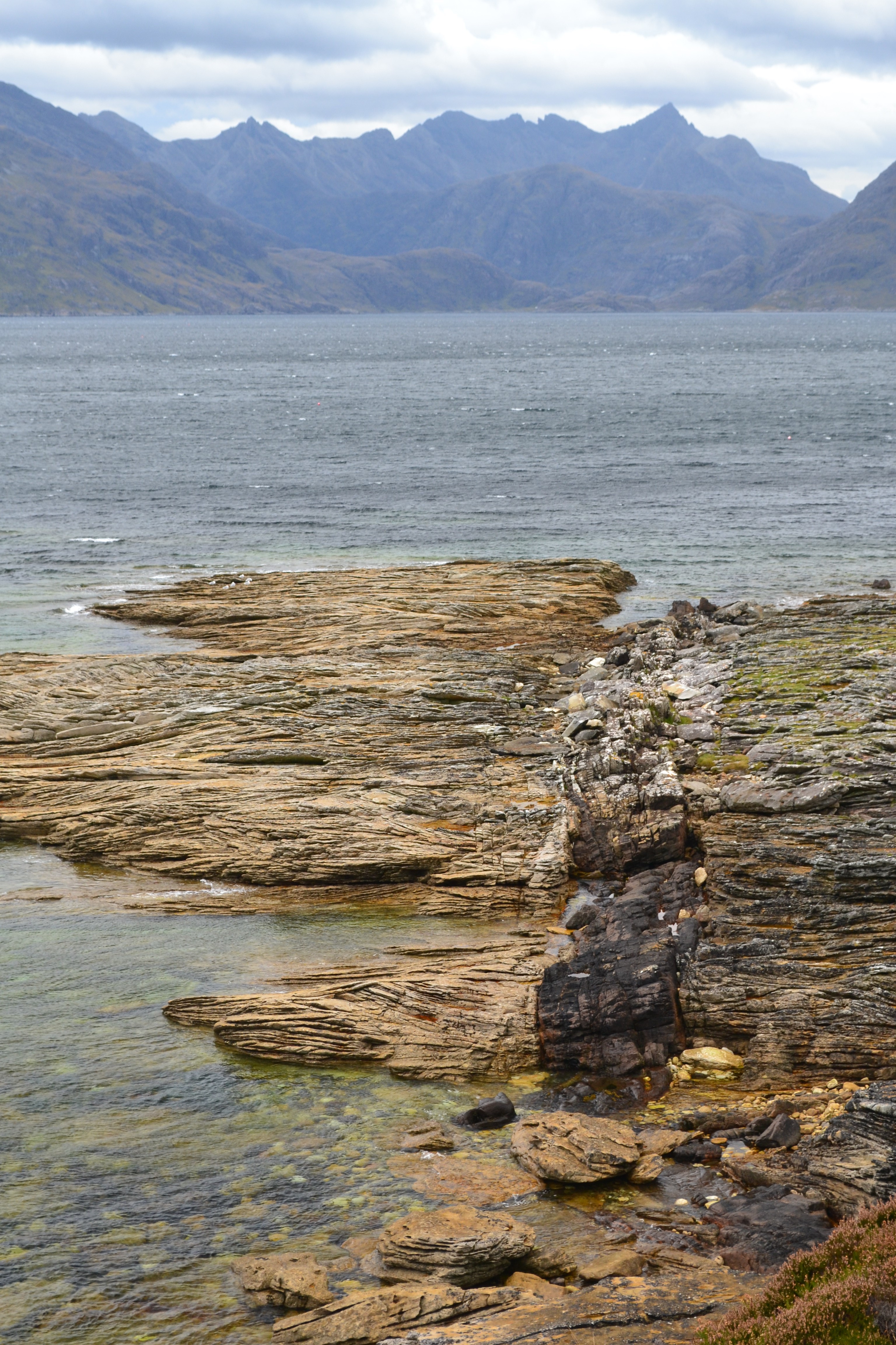 These hills are made up of layered sheets of gabbro (a coarsely crystalline equivalent of basalt, which cooled more slowly deep in the Earth), stacked rather like nested, upside down plastic cups. The Cuillin gabbros are cut by granites of the Western Red Hills. Other granites form the Eastern Red Hills. Granites are coarsely crystalline like Gabbro, but are lighter in colour because they contain more quartz. Some of these granites formed by a process of chemical evolution called ‘fractionation’. As magma crystallizes, different components crystallize out at different times, leaving behind a melt that becomes progressively rich in silica, which forms quartz when it cools.