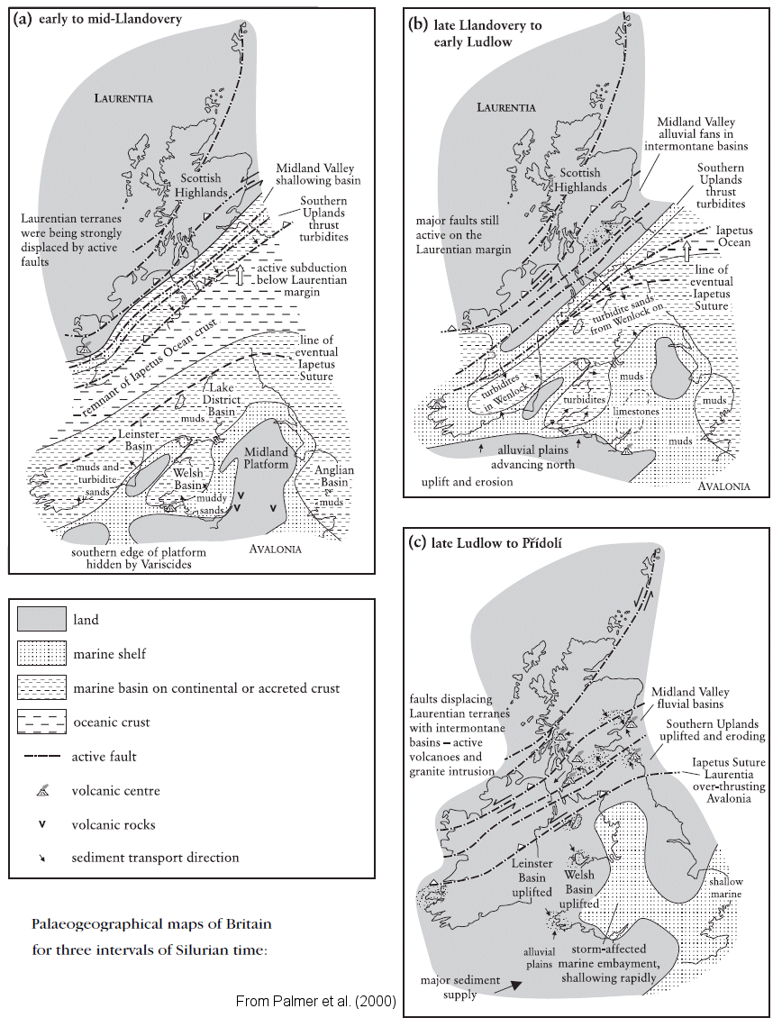 Late Llandovery to early Ludlow: Offscraping of deep-marine turbidites at the Laurentian margin continued from late Llandovery (Hawick Group) into late Wenlock time (Riccarton Group). Shallow marine environments in the upper Llandovery of the Scottish Midland Valley gave way to subaerial alluvial fans in the Wenlock. On Avalonia, the Midland Platform accumulated an upper Llandovery to Ludlow succession, dominated by mudstones (e.g. Coalbrookdale Formation). Shorter periods of limestone deposition (Woolhope, Buildwas and Much Wenlock Limestone formations) coincide with lowstands in eustatic sea-level. The Welsh Basin received large volumes of SW-derived turbidite sand (Cwmystwyth Grits Group and Penstorwed Grits Formation of the Tranearth Group) from late Llandovery time onwards (probably sourced from uplifted areas in the Laurentia–Avalonia collision zone. The Lake District Basin accumulated mostly mudstones until early Wenlock time (e.g. Brathay Formation), receiving the first substantial turbidite sands into its southeastern part in the mid-Wenlock (Birk Riggs & Coldwell Formations), with the main turbidite influx during early Ludlow (Coniston Group).