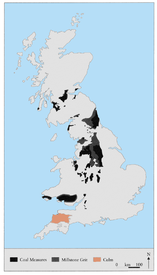 There is considerable variation in the lithostratigraphical development of the Upper Carboniferous and different areas generally have their own formations. However, there is an underlying pattern of lithofacies broadly recognizable as eight groups/supergroups. A) Holsworthy Group: predominantly marine or marginal non-marine turbidite and deltaic deposits found in the Culm Trough (Component formations: Bealsmill Sandstone, Crackington, Bideford and Bude). B) Millstone Grit Group: mainly marine to non-marine shales and deltaic to fluvial sandstones found in the Namurian and locally basal Westphalian of central and northern England and North Wales (component subdivisions:,Pendleton, Silsden, Samlesbury, Hebden, Marsden and Rossendale in the Pennines; Cefn-y-fedw Sandstone in North Wales; Morridge in the English Midlands; and First Grit and Second Grit in northern England). In South Wales and southern England, the equivalent succession is represented by the Marros Group (component formations: Twrch Sandstone, Bishopston Mudstone and Telpyn Sandstone in South Wales and Quartzitic Sandstone in the Bristol area. C) Coal Measures Supergroup: grey coloured of fluvio-lacustrine origin, often including coal deposits, and thin marine beds (component groups: South Wales, Pennine and Scottish Coal Measures). D) Warwickshire Group: mainly primary alluvial red beds (component formations: Etruria, Halesowen, Salop in central England and North Wales; Whitehaven Sandstone in northern England, Pennant Sandstone and Grovesend in South Wales and southern England). The final closure of the Rheic Ocean led to the Variscan or Hercynian Orogeny during late Westphalian to Permian times. The sediments of the Warwickshire Group are in part the product of this deformation event (extracts modified from Cleal and Thomas, 1996).