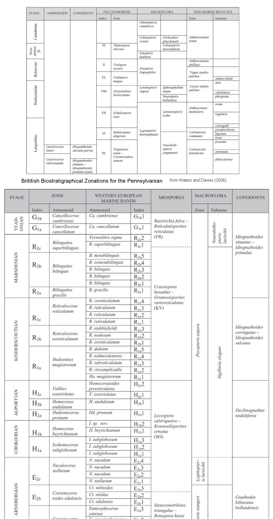 Biostratigraphical sub-division of the British Upper Carboniferous is based mainly on ammonoids (goniatites), with non-marine bivalves, miospores and plant macrofossils also of importance. Marine bands (defined lithostratigraphically as a particular rock body, but also biostratigraphically) have then been used as the basis for defining the British chronozones and stages, often named with reference to particular ammonoid taxa (e.g. Subcrenatum Marine Band, Bilinguites bilinguis Marine Band. Cineritic tonsteins, (result of volcanic ash-falls) have also been extensively used for sub-division particularly in Europe (important for establishing correlations between the paralic coalfields and intra-montane basins).