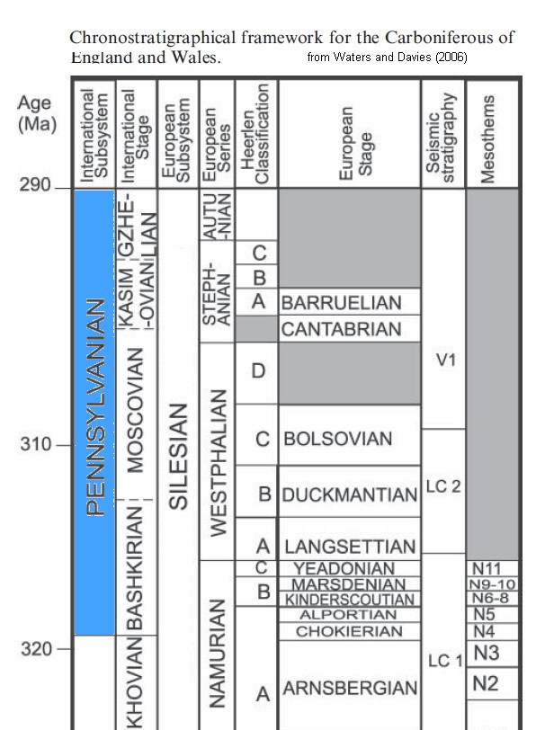 Waters, C N, Somerville, I D, Jones, N S, Cleal, C J, Collinson, J D, Waters, R A, Besly, B M, Dean, M T, Stephenson, M H, Davies, J R, Freshney, E C, Jackson, D I, Mitchell, W I, Powell, J H, Barclay, W J, Browne, M A E, Leveridge, B E, Long, S L, And Mclean, D. (2011). A Revised Correlation of Carboniferous Rocks in the British Isles. Special Report No. 26. (London: The Geological Society).