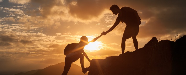 Image first climber helping second climber over a rocky ledge Shutterstock 760304731