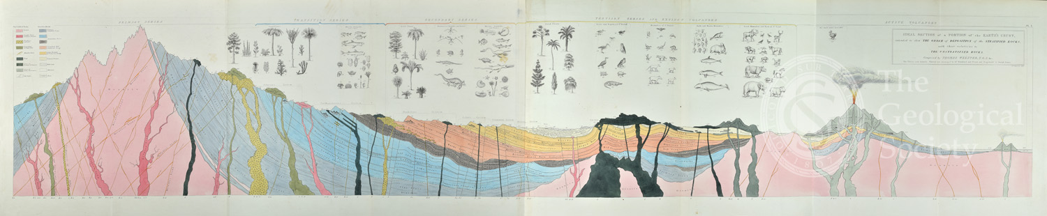 Not much is known about the three plates, other than that they were in the possession of George Bellas Greenough, and formed part of the bequest given to the Society in 1856. The plates still bear Greenough's original labels on which he states that the contents had been taken without acknowledgement from William Buckland's 'Bridgewater Treatise' [Geology and mineralogy considered with reference to natural theology, published in 1836]. Whilst the striking top section and overall concept is obviously based on Buckland's section from ‘Bridgewater Treatise’ (itself copied from the work of Thomas Webster), the publishers, Im Verlage des Landes-Industrie-Comptoirs, have expanded the imagery to include a number of contemporary works from other leading scientists of the day including Louis Agassiz (1807-1873), Charles Lyell (1797-1875) and Georges Cuvier (1769-1832). Hence the plates describe what was known of the subject at the time of publication – a lesson in elementary geology if you like.