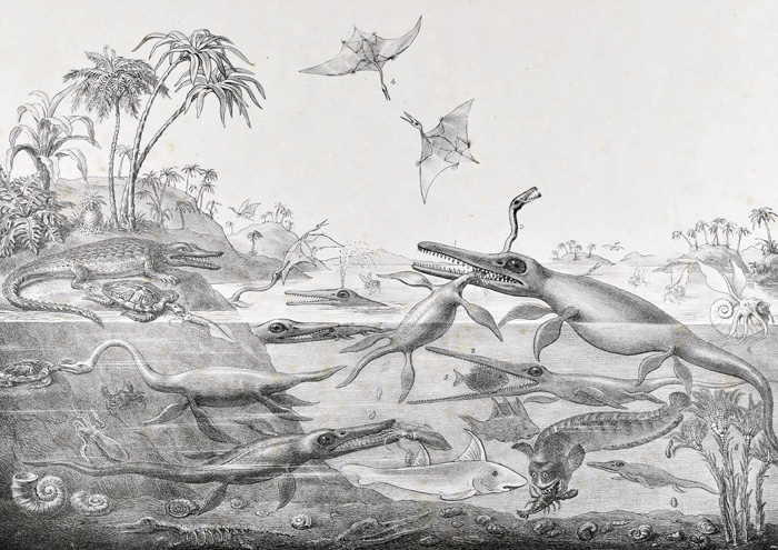 His lithographic print Duria Antiquior, is one of the most important and influential geological images ever produced. It is the very first reconstruction of ancient life, from which all others that have followed can be traced - right through to the Jurassic Park movies. The image reconstructs Dorset during the Jurassic Period populated with the ichthyosaurs, plesiosaurs, pterosaurs, ammonites, belemnites and other creatures and plants which Mary Anning discovered. Even coprolites (fossil faeces) make an appearance, with many of the creatures, who all seem to be attacking each other in some way or other, excreting freely into the sea.