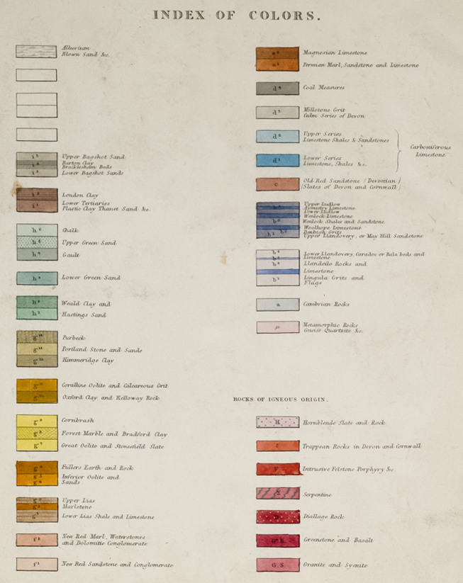 The Committee had pledged their intention that the new map was to stick as closely as possible to Greenough’s carefully chosen palette developed over the first two editions. However this seems to have been abandoned as the end result more closely resembles Roderick Murchison’s newly devised colour scheme which was introduced onto the Geological Survey maps in 1855. Confusingly Murchison's new colours, which are reminiscent of William Smith's, replaced those of his predecessor Henry de la Beche (1796-1855) which were based on the second edition of Greenough's map.