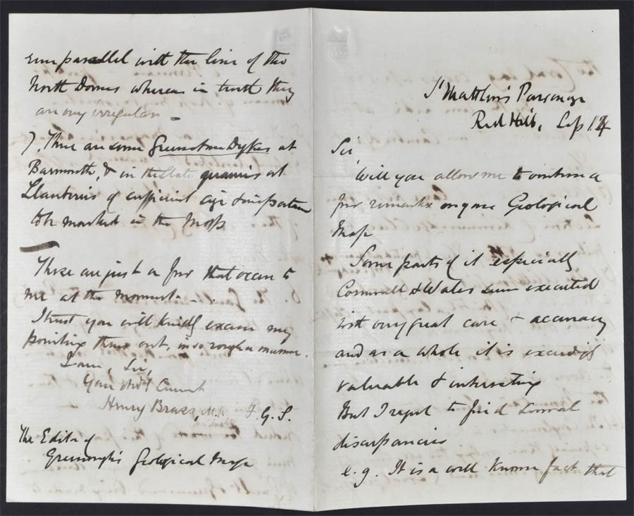 Letter from the Rev Henry Brass, 14 Sep [1865-1869] detailing the errors in the new map. (GSL/COM/MAP/3)