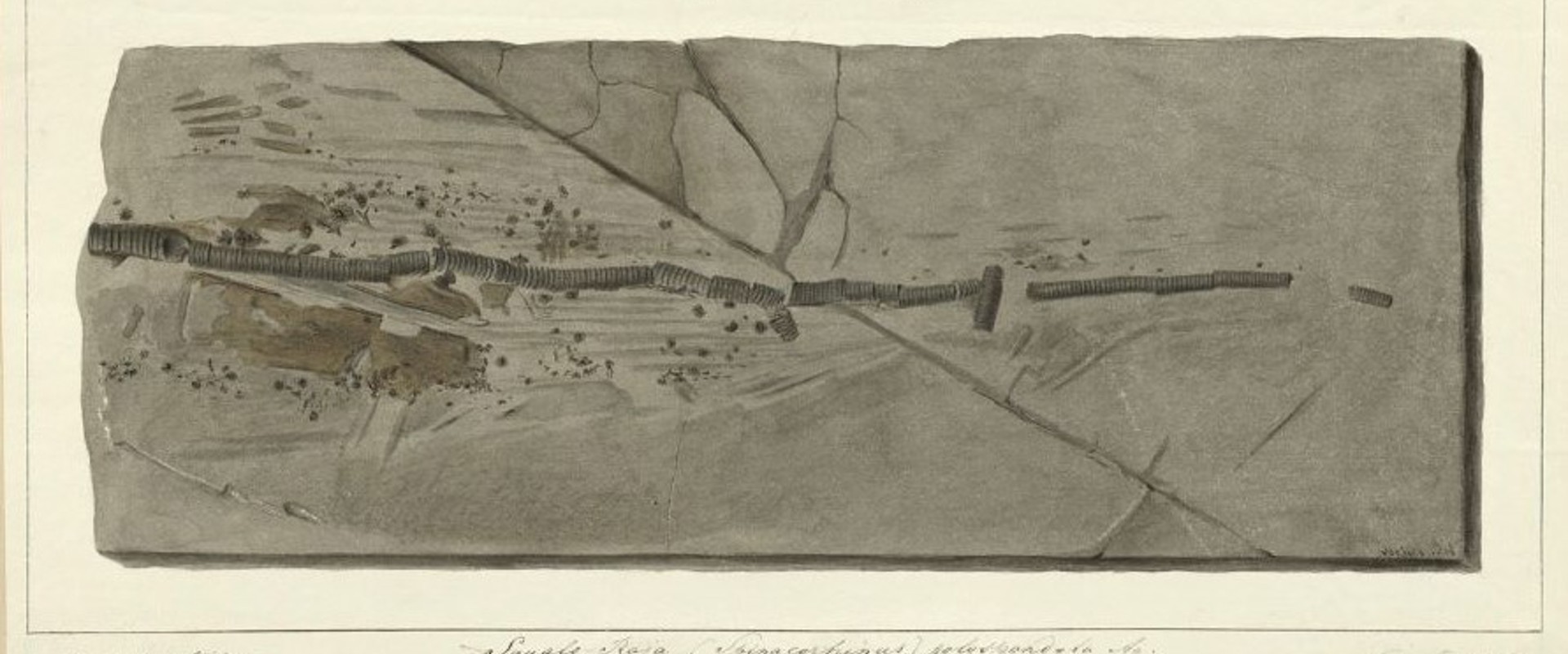 Watercolour of the tail Squalo-raja polyspondila Agassiz, by Charles Weber, [1835]. Found in the Lias, Lyme Regis, from the collection of Miss Philpot. GSL Archive ref: LDGSL/613/4/100/1.
